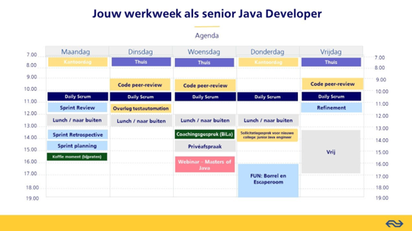 Benieuwd hoe jouw werkweek eruit kan zien als senior Java developer bij NS? Wij geven je een voorbeeld van jouw toekomstige agenda.