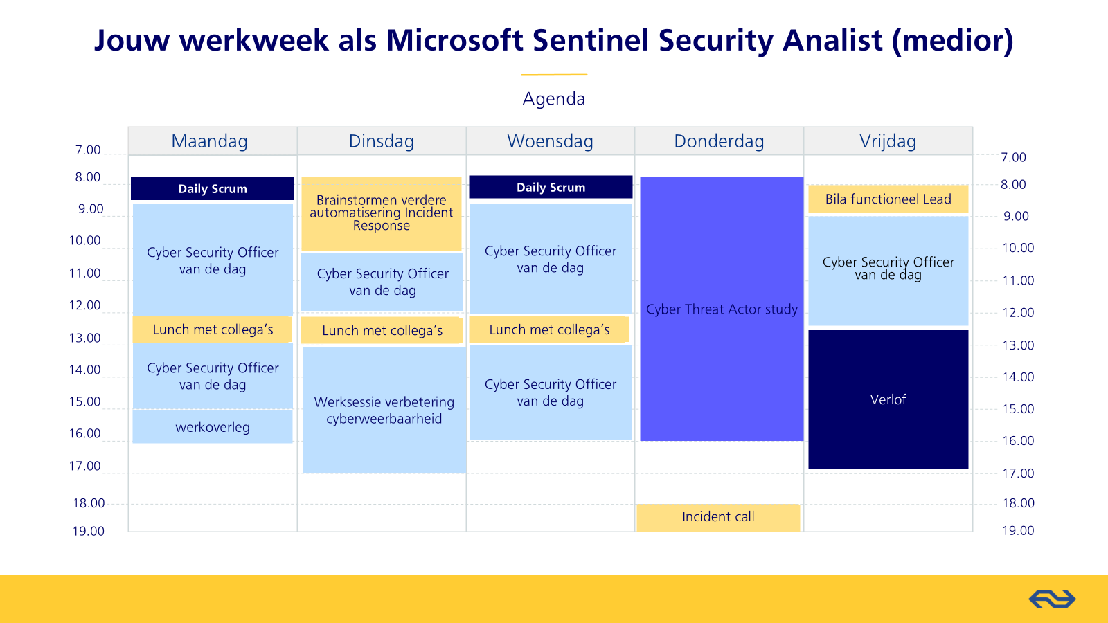 Ben je benieuwd hoe jouw werkweek eruit kan zien als Microsoft Sentinel Security Analist bij NS? Wij geven jou een voorbeeld van jouw toekomstige agenda. Samen kijken we hoe we persoonlijke ontwikkelingen en ambities hierin een plekje kunnen geven.